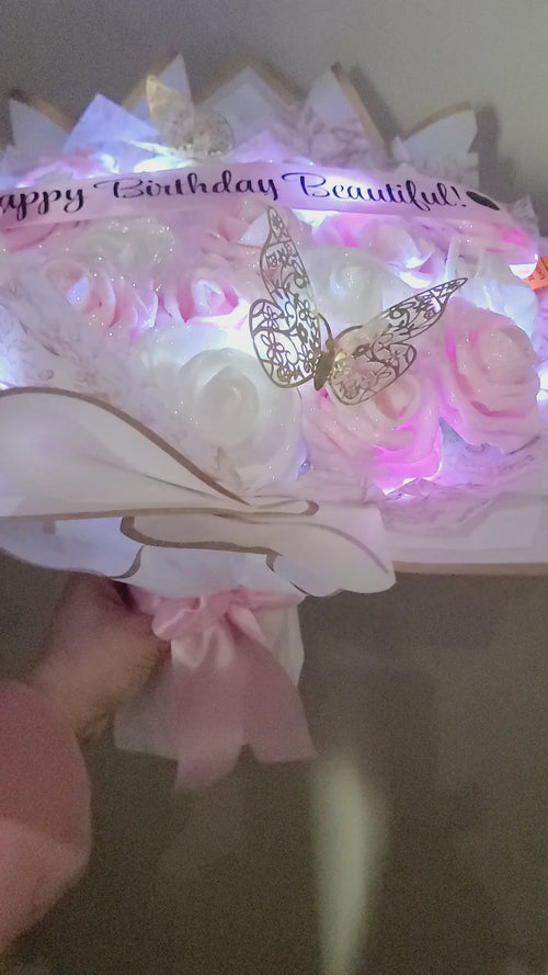 Celebrate a special occasion with our Graduation Glitter Roses Bouquet. Embellished with a graduation cap and diploma, this bouquet is the perfect gift for graduates. Add a banner and lights for an extra festive touch. Show your loved ones how proud you are with this beautiful bouquet.